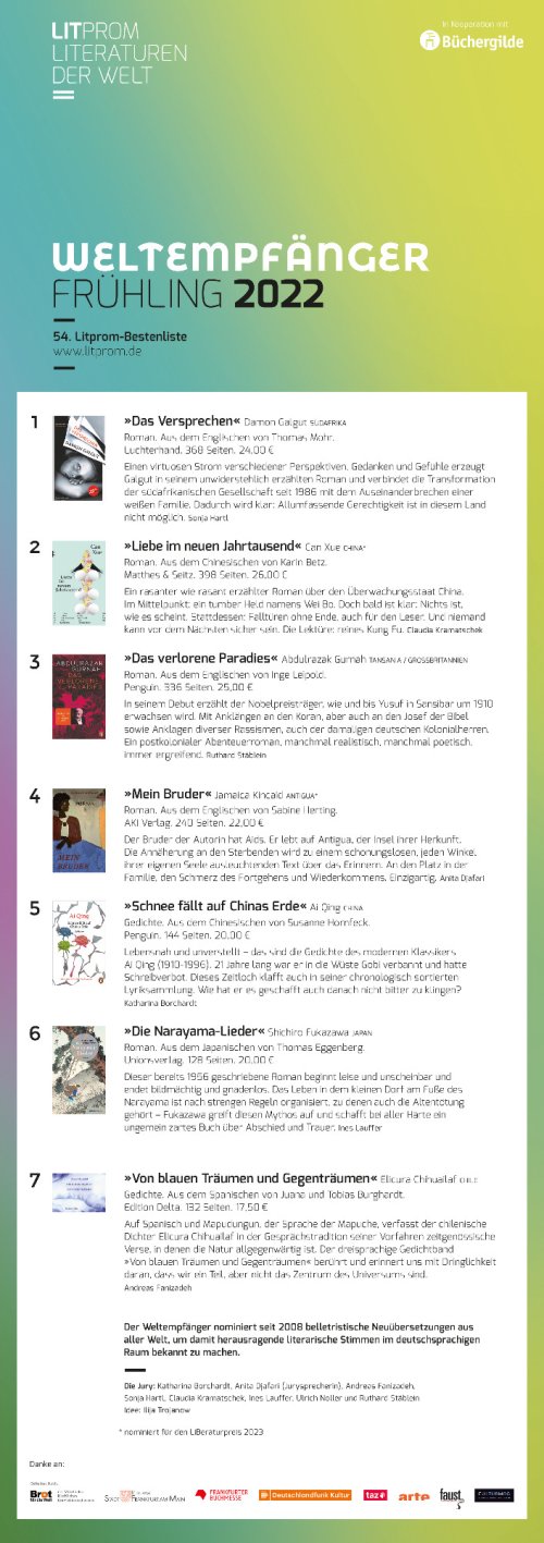 Der Gewinner des Booker Prize Damon Galgut führt den Weltempfänger 54 an, gefolgt vom Literaturnobelpreisträger Abdulrazak Gurnah. Mit Entdeckungen aus China, Japan und Antigua zeichnet diese Ausgabe der Bestenliste ein vielseitiges Bild von Kolonialismus, Überwachung, Abschied und Trauer. Zartere Töne chinesischer und chilenischer Lyrik fangen die Härte gesellschaftspolitischer Realitäten auf.