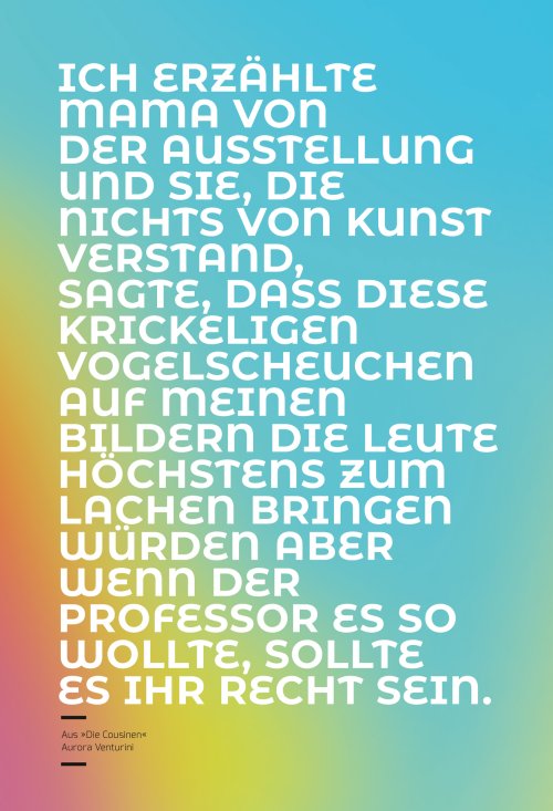 [Zitat rechts aus: »Die Cousinen« von Aurora Venturini, Übers. Johanna Schwering, Platz 1]