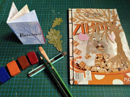Jetzt kommt die Fantasie ins Spiel. Wir basteln ein kleines Faltbuch, in das ihr Ideen zu Eurer eigenen Geschichte schreibt und zeichnet. Aus Pappverpackungen, die sonst im Papiermüll gelandet wären, schneiden wir Buchdeckel und bemalen sie. Aus Schmierpapier für den Innenteil binden wir mit ihnen ein Buch für eure Geschichte.